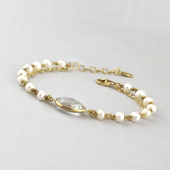• Βραχιόλι ασήμι 925 επιχρυσωμένο με white quartz και μαργαριτάρι